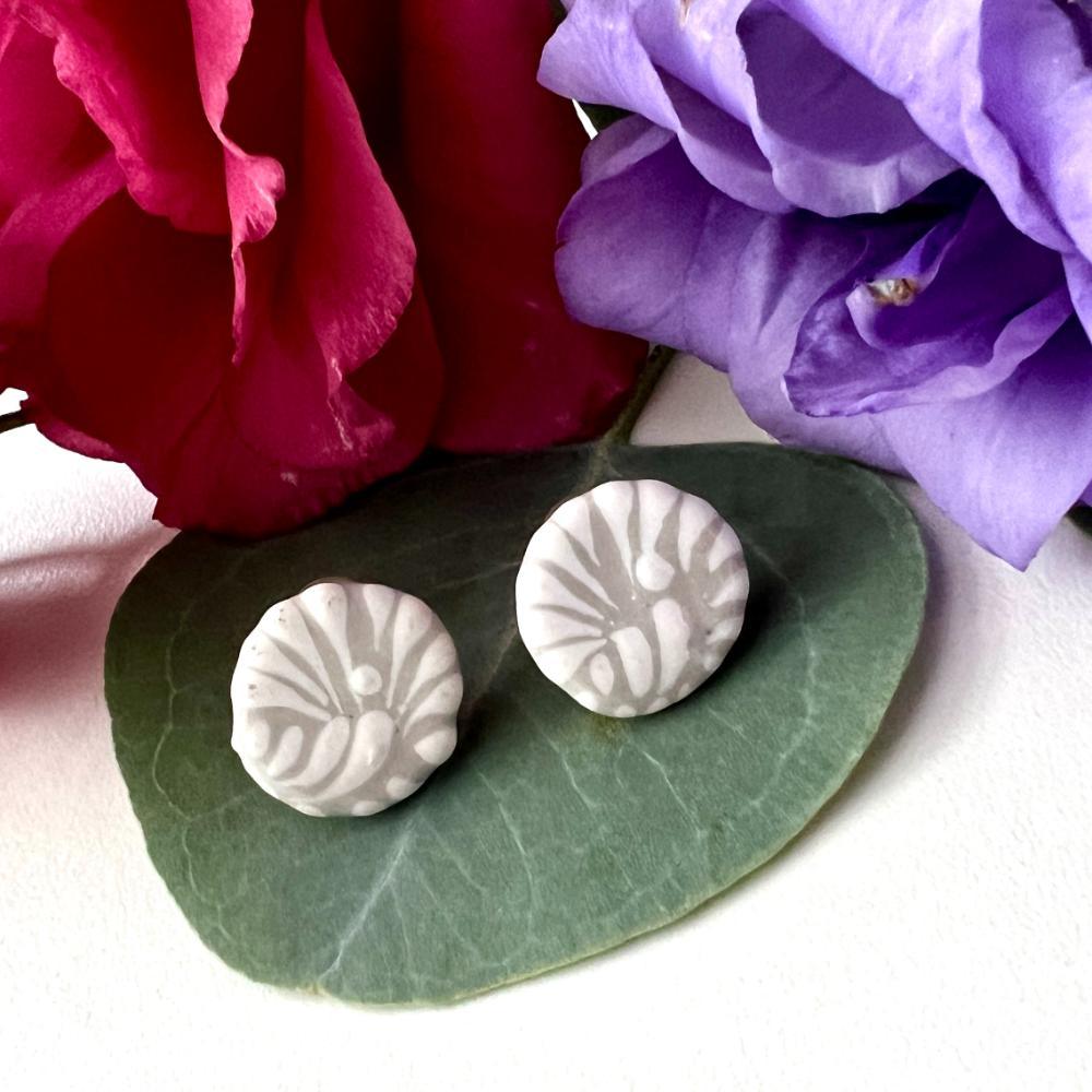 Precioso broquel redondo talavera gris. La talavera es de Puebla y se elabora a mano. Cada pieza es única, por lo que siempre habrá ligeras diferencias entre los tamaños de los dijes y en el decorado.