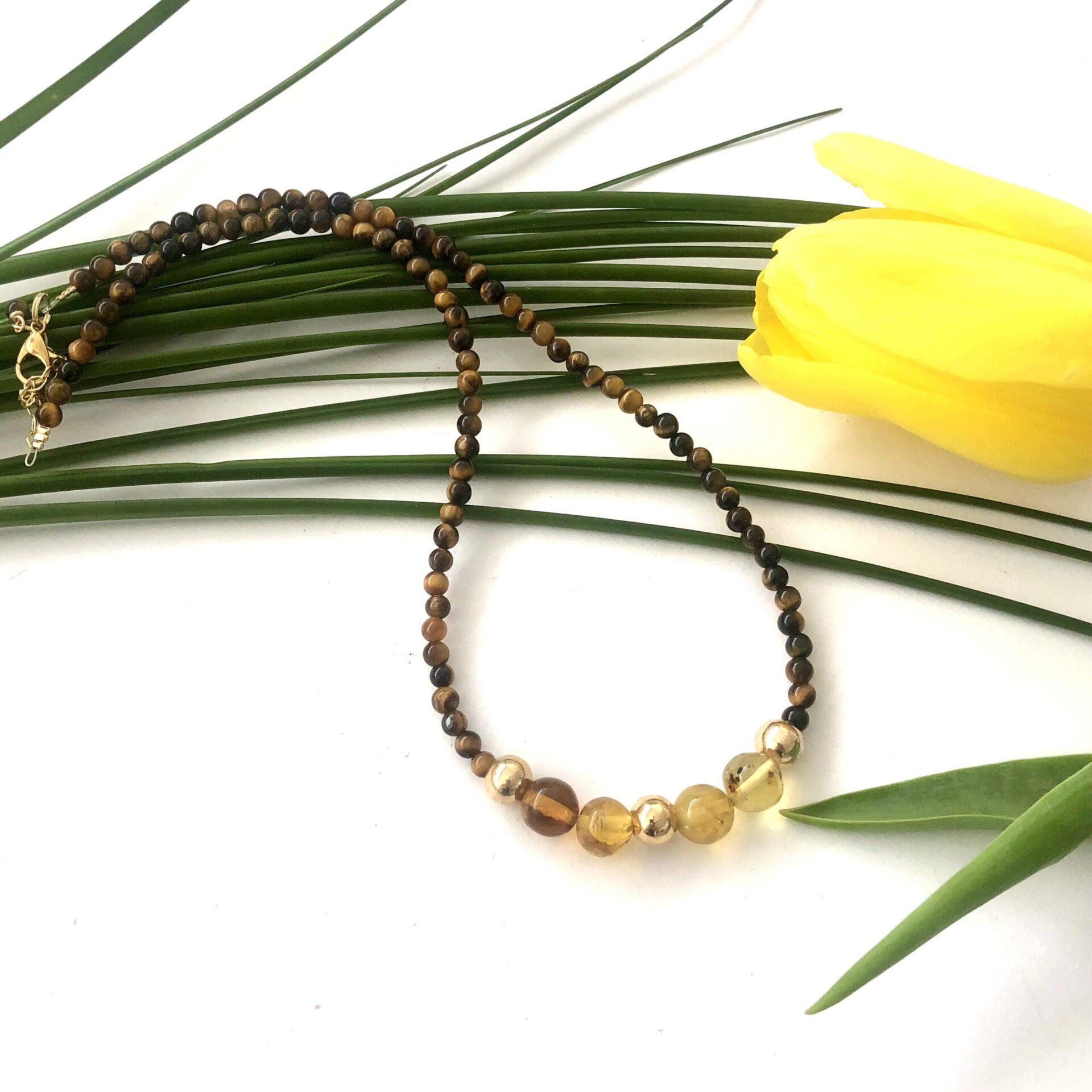 Este collar de ámbar y piedra natural es de estilo boho-chic. El ojo de tigre enmarca y realza la belleza de los dijes centrales de ámbar.