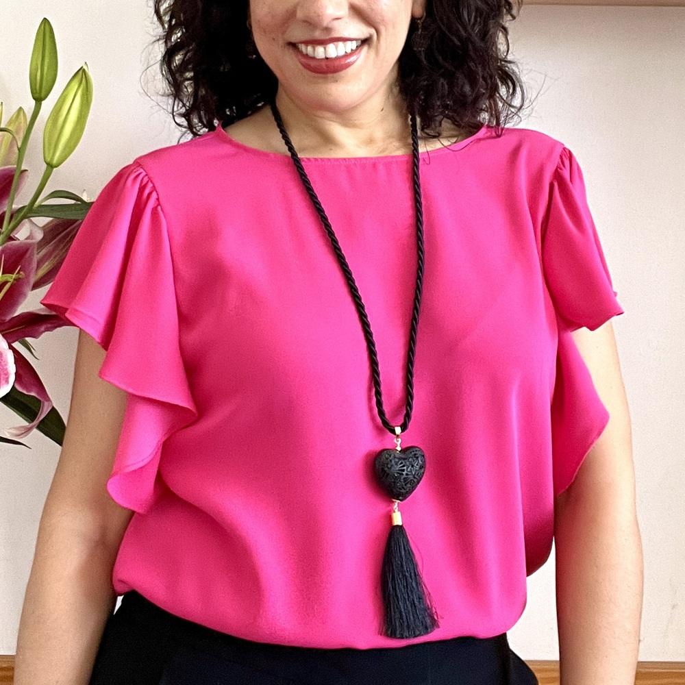 Este collar tiene un dije de corazón de barro negro que se complementa con una borla. Es un accesorio elegante y original. El corazón es de 4.5 cms de diámetro aproximadamente. Las mechas en la parte final del corazón miden 10 cms. El cordón del collar es de 80 cms de largo. Puedes hacerle un nudo al cordón para hacer un poco más corto tu collar.