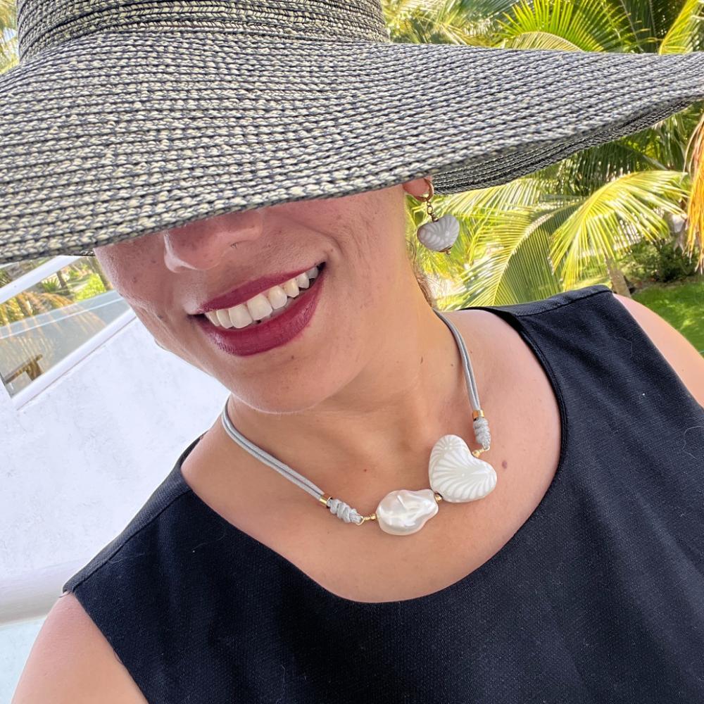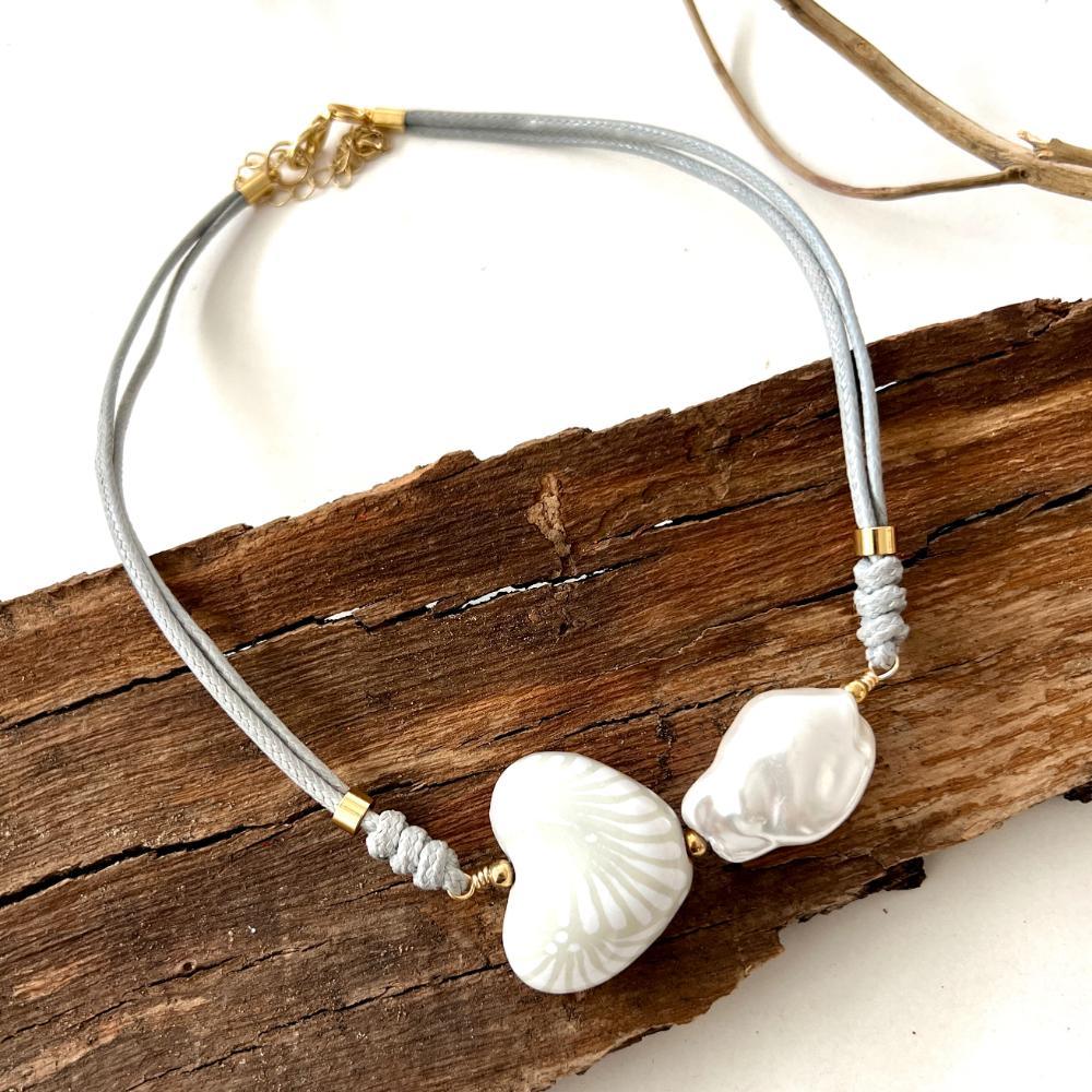 Exquisito y delicado collar talavera gris corazón. La talavera gris tiene el mismo proceso de elaboración que la talavera azul, la única diferencia son los pigmentos que le adicionan para que tome el color gris.
