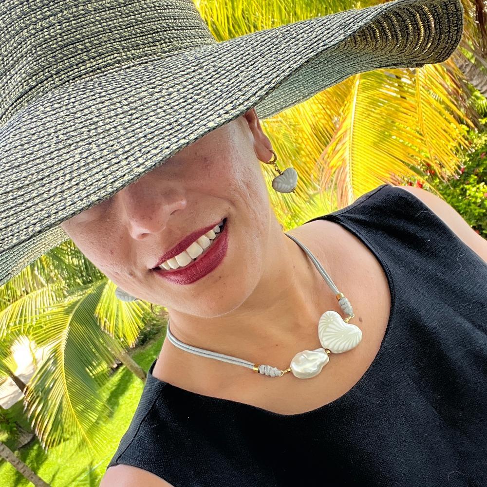 Collar corto de 34 centímetros. Tiene una extensión de 9 centímetros. Tiene una perla barroca de 3 centímetros aproximadamente. El dije de corazón es de talavera gris de 2.5 centímetros de largo por 3.5 centímetros de ancho.