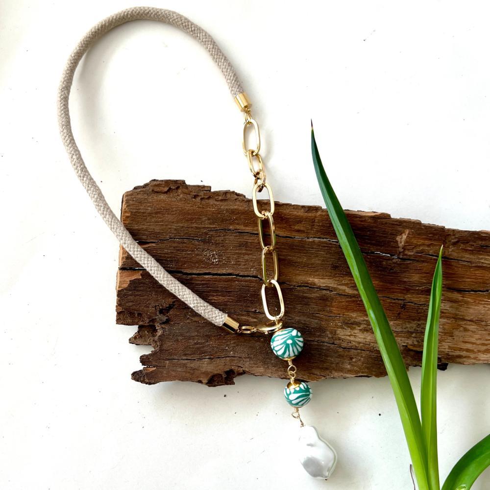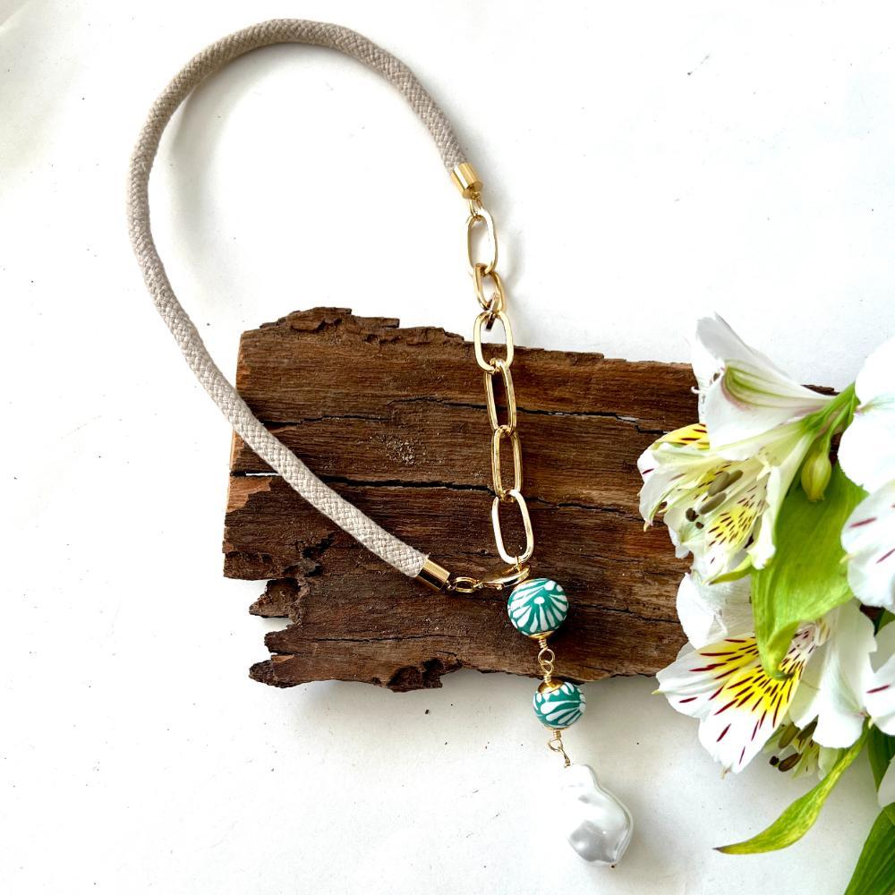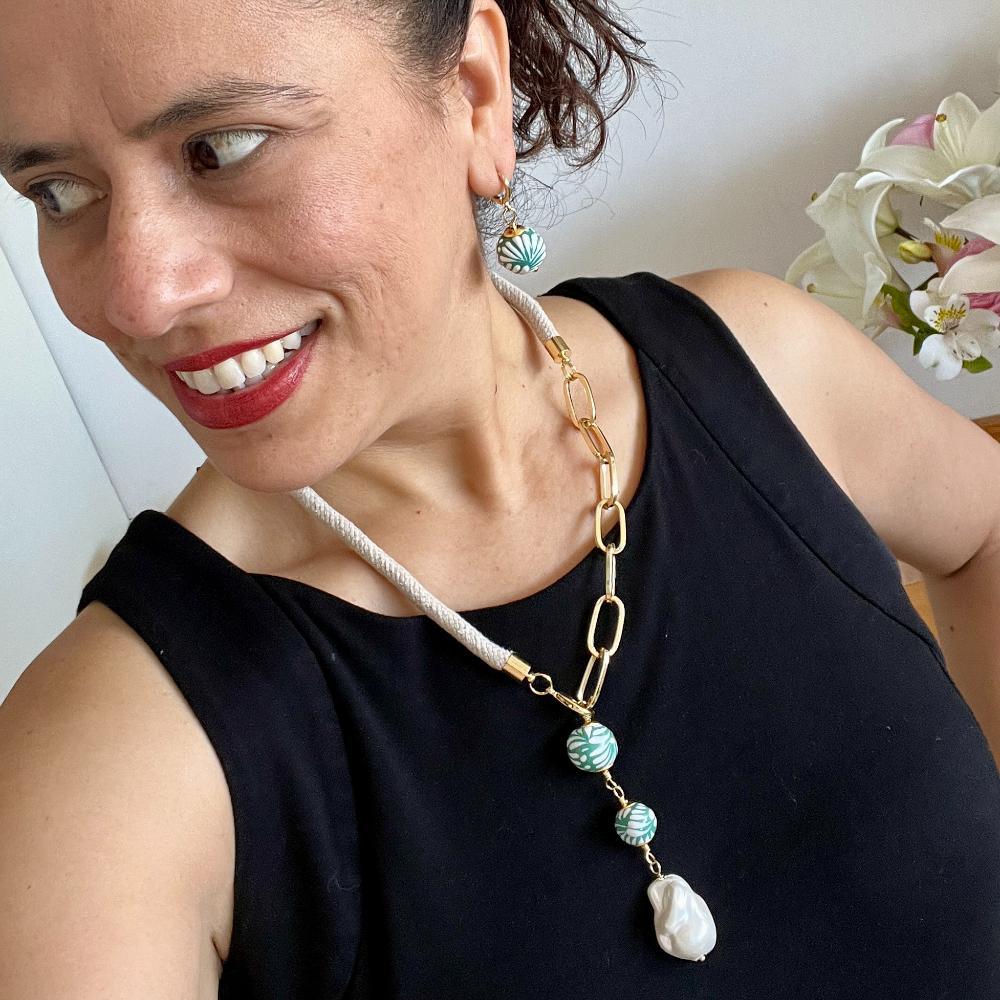 Hermoso collar talavera verde cadena y perla. Este collar combina con todo. Es un básico que no te debe faltar si eres amante de las artesanías. Realza tu look y se adapta tanto a los atuendos casuales como formales.