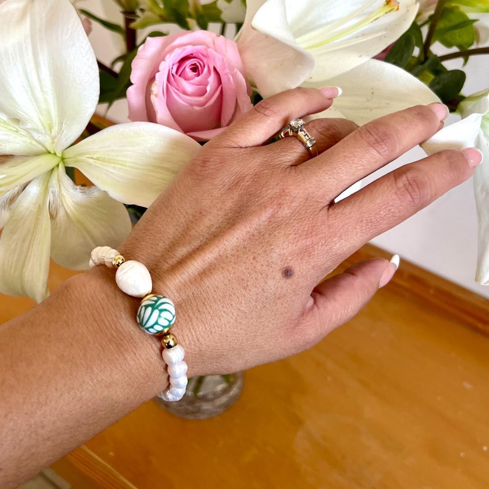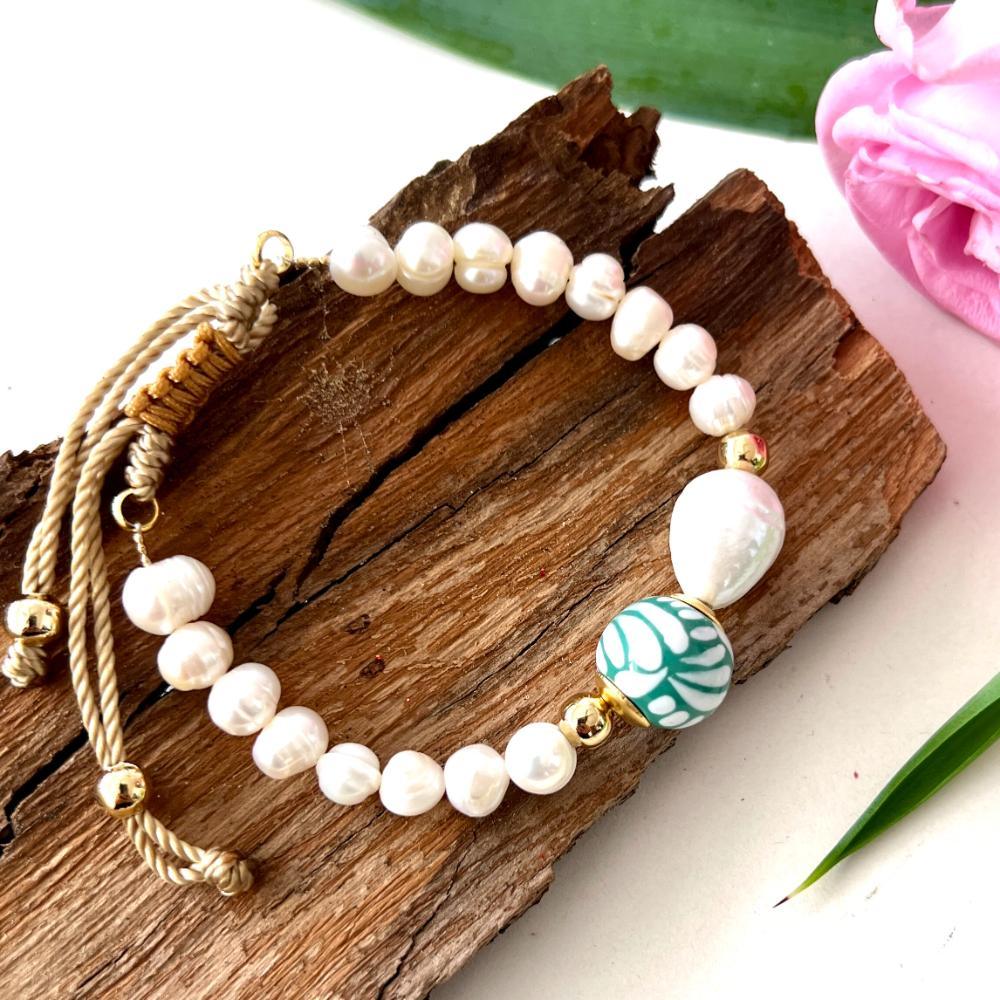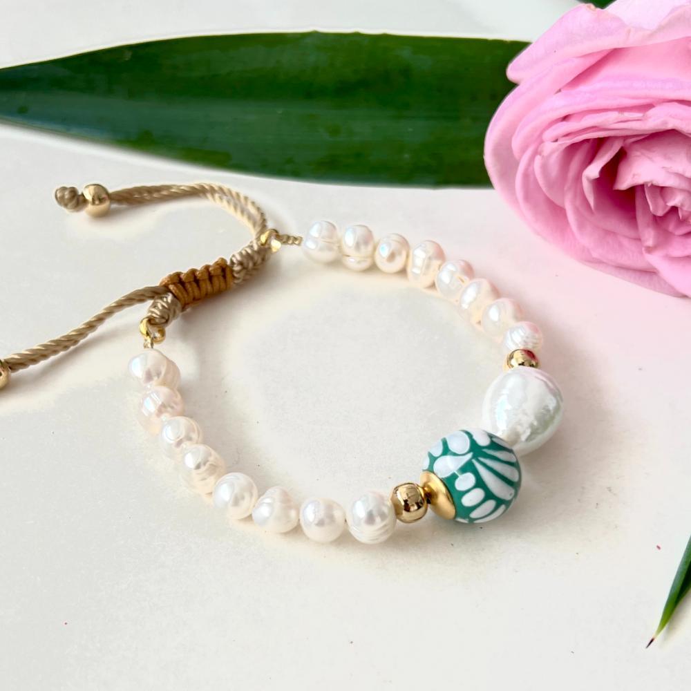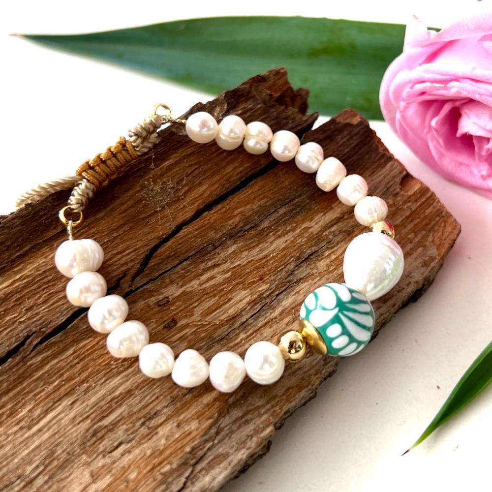Hermosa pulsera perlas y talavera verde. Combina con todo. Es un básico que no te debe faltar si eres amante de las artesanías. Se adapta tanto a los atuendos casuales como formales.