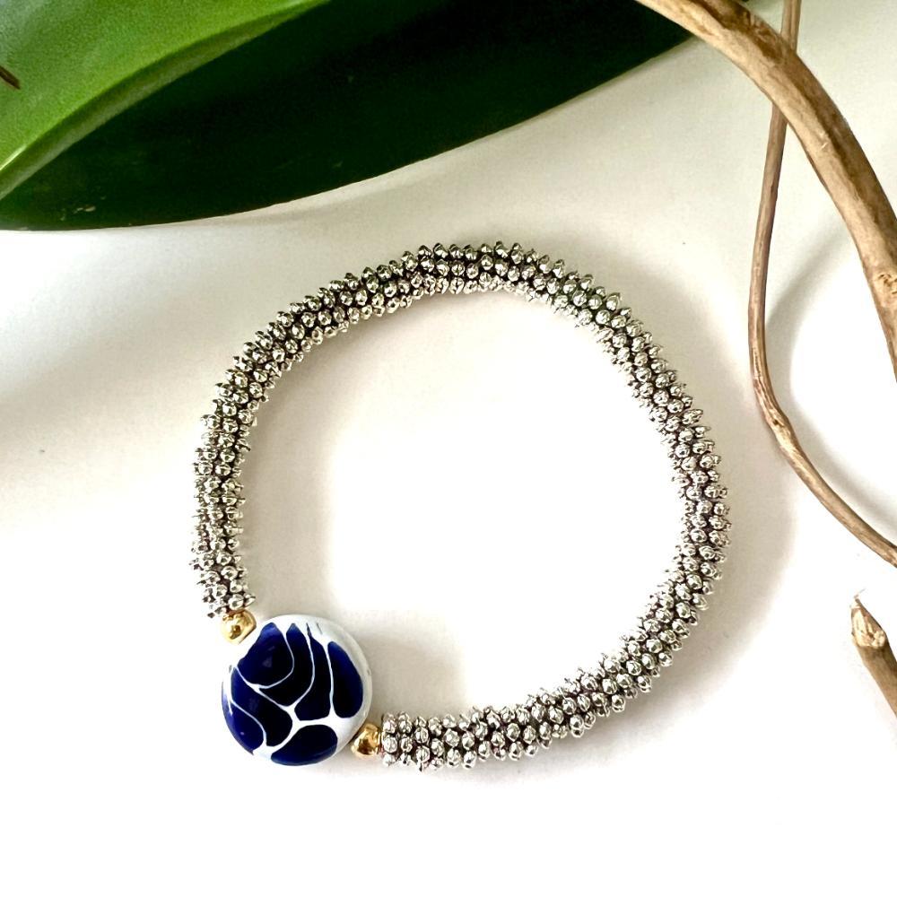 Recuerda que cada pieza de talavera es pintada a mano, así que siempre habrá diferencias en las decoraciones entre una pieza y otra. Tu pulsera será similar a la de la foto, pero no será exactamente igual.