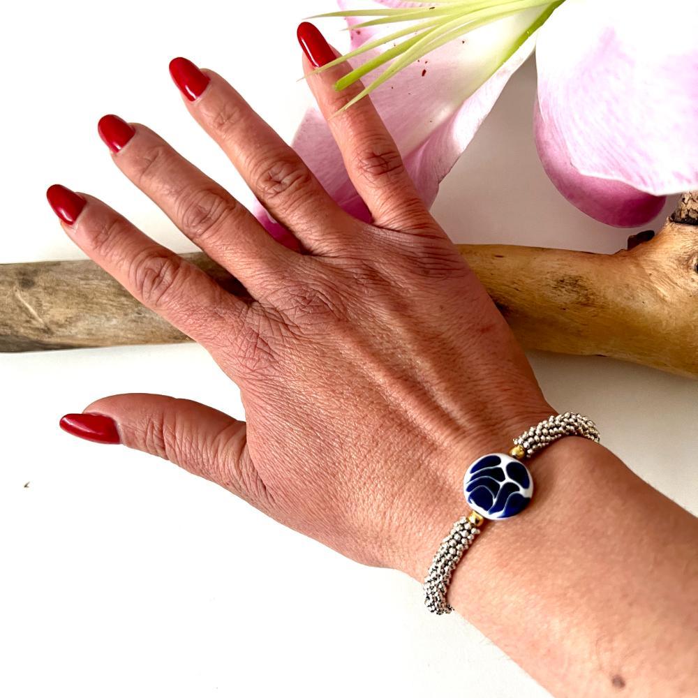 Hermosa pulsera pewter circulo talavera. Esta pulsera es una obra artesanal única, hecha a mano en Puebla.